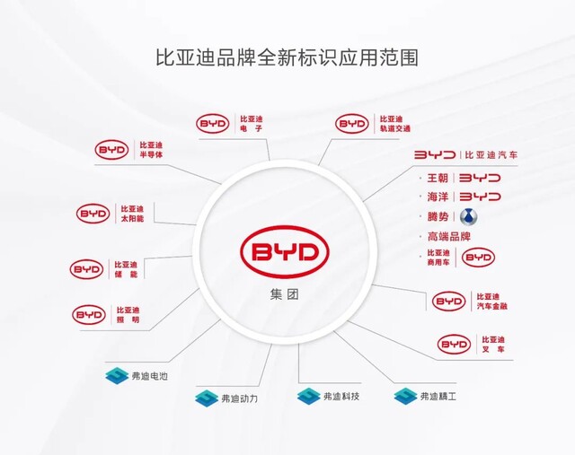 比亞迪集團(tuán)新標(biāo)識(shí),將在旗下電子、新能源、軌道交通以及汽車產(chǎn)業(yè)中使用,與此同時(shí),汽車產(chǎn)業(yè)的乘用車板塊各品牌將使用各自的品牌標(biāo)識(shí)。